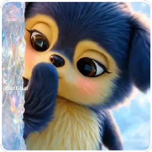 A blue and yellow puppy peeking from behind an ice column, with a curious expression and wide eyes.