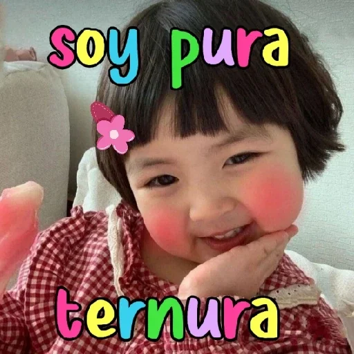 A girl with rosy cheeks and a small flower clip in her hair, wearing a red checkered shirt. She has her hand on her chin and colorful text that reads 'soy pura ternura'