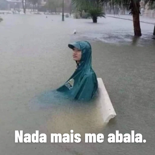 Man in green jacket sitting on a chair in the middle of a flood, with the phrase 'Nada mais me abala.'