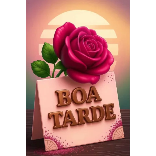 A red rose on a card with 'BOA TARDE' in brown letters, with a sunset in the background.