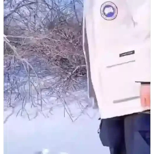A man wearing a white coat with a blue and black emblem, black pants, in a snowy environment with dry branches.