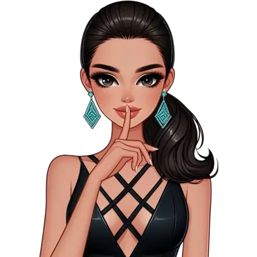 A woman with long black hair making a silence gesture, wearing a black dress with crisscross details and blue earrings.