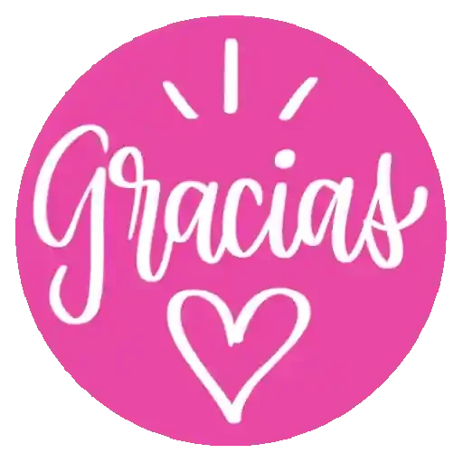 A pink circle with the word 'Gracias' written in white cursive, a heart drawn below, and lines expressing joy above.
