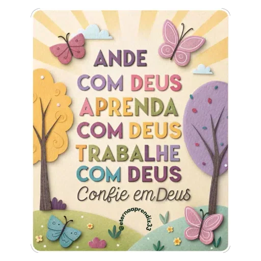 A colorful illustration with trees, butterflies, and flowers, featuring the text "ANDE COM DEUS APRENDA COM DEUS TRABALHE COM DEUS Confie em Deus" in multicolored letters.