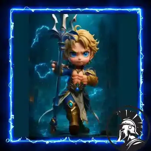 A blond boy with blue eyes, wearing golden armor, holds a trident against a dark blue background with light effects.