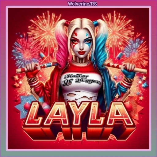A woman with pink and blue hair and colorful makeup, wearing a red jacket and a white shirt with text, holds sticks in each hand. The background features fireworks and the name 'Layla' is written in large letters.