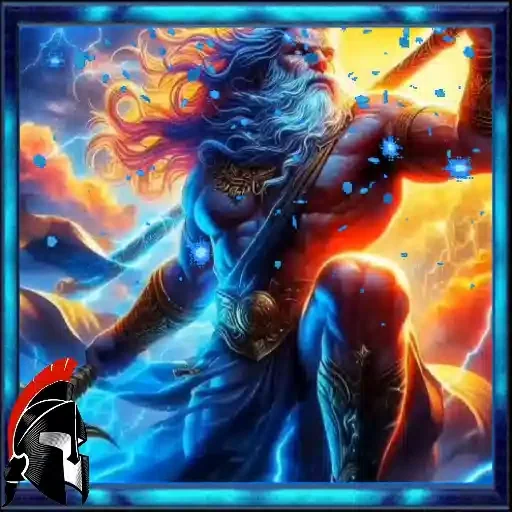 A muscular man with long, wavy hair and beard, wearing armor, holds a sword and emits a blue electric aura against a background of flames and orange sky.
