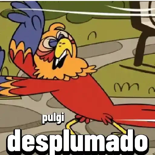 A colorful bird, likely a parrot, with red, orange, and blue feathers, is in a funny pose with the text 'pulgi desplumado' underneath.