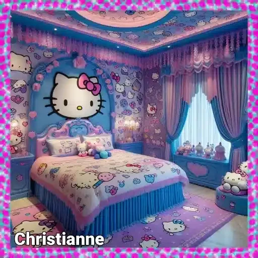 Children's room with pink and blue bed, covered with a Hello Kitty duvet and a headboard with Hello Kitty's face. The name 'Christianne' appears at the bottom left.