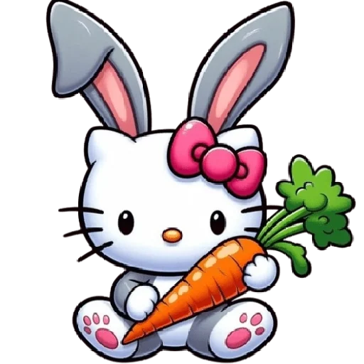 Rosto de Hello Kitty com um laço rosa, fazendo um gesto com a mão e com dois triângulos rosas atrás da cabeça.