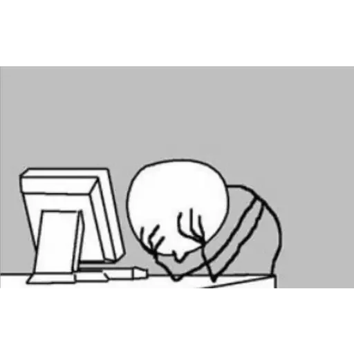 A drawing of a person with their head down and hands in front of a computer, looking like they are sleeping or very tired.