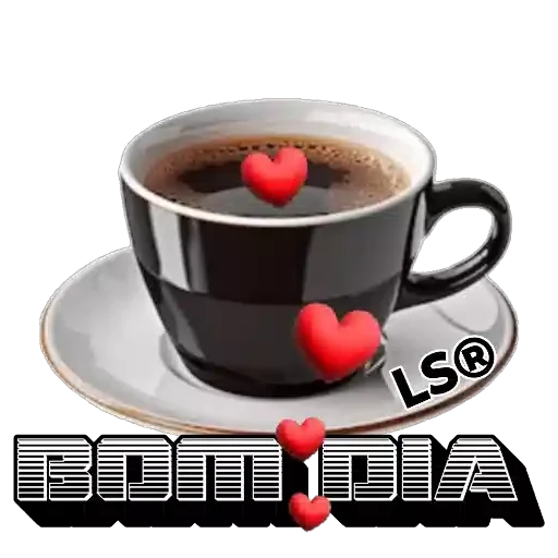 A black coffee cup on a white saucer with three red hearts and the text 'Bom Dia' in large letters.
