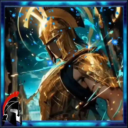 A Roman or Greek warrior in golden armor and helmet, on a blue background with light and particle effects. He is in a heroic pose.