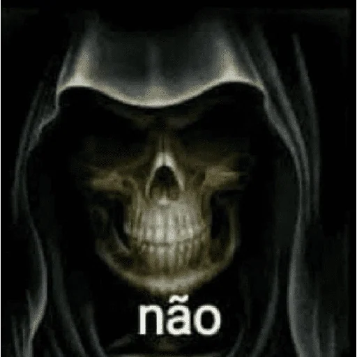 A skull with dark eyes and a sinister expression, wearing a dark hooded cloak, with the word 'não' written in white at the bottom.