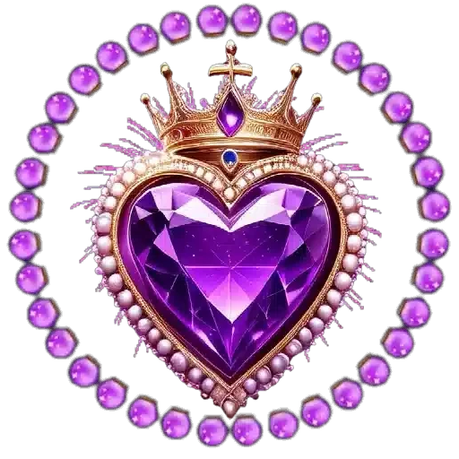 A purple gemstone heart with a golden crown on top, surrounded by a border of small purple stones.