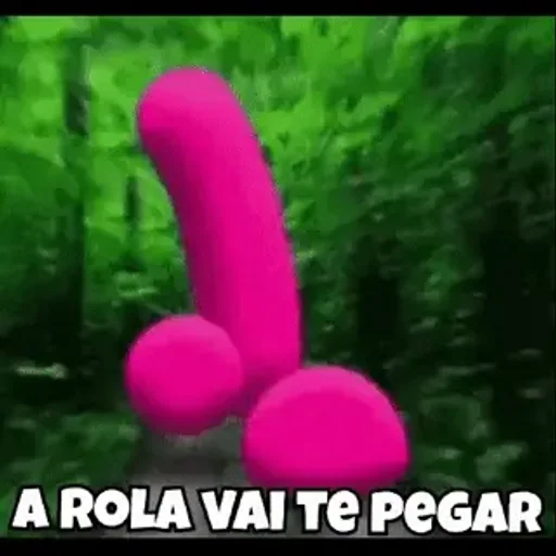 A bright pink phallic-shaped object in a green environment, with the phrase 'A ROLA VAI TE PEGAR' in white letters at the bottom.