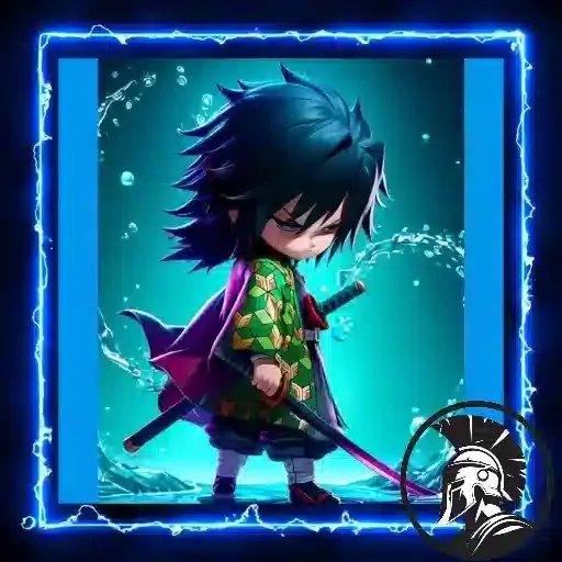 Anime character with black hair and green clothes, holding a sword, on a blue background with light effect.