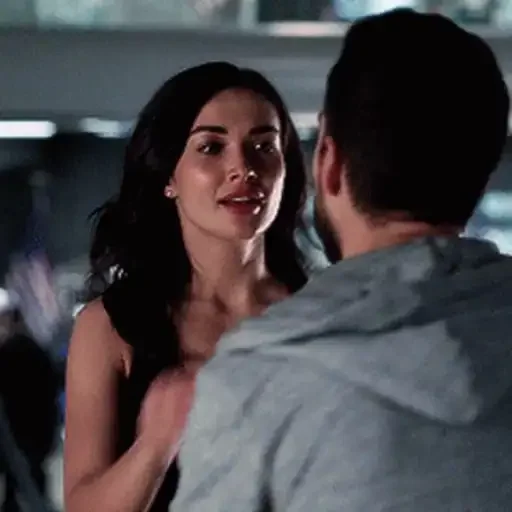 A woman with black hair and a black dress looks at a man in a gray jacket, appearing surprised or shocked.