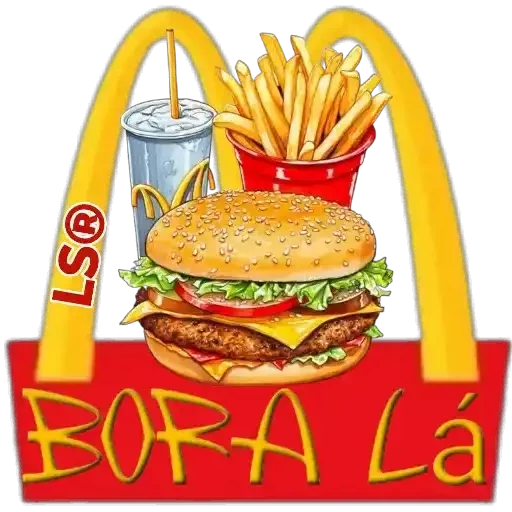 An illustration of a McDonald's bag with a double hamburger, french fries, and soda. The text 'BORA LÁ' is written at the bottom of the bag.
