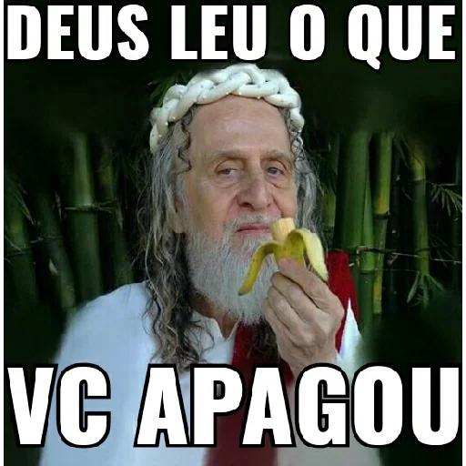 A man with a god-like appearance, wearing a crown and having a long beard, eating a banana with a surprised expression. The text 'DEUS LEU O QUE VC APAGOU' is written above and below him.
