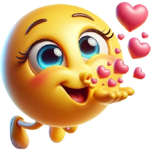A yellow emoji with blue eyes and eyelashes, rosy cheeks and a smile, blowing kisses represented by small pink hearts, with a larger heart floating above.