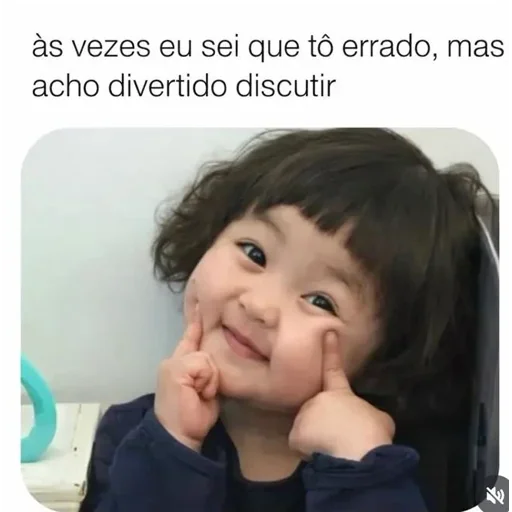 Boy with a thoughtful and amused expression, hands on face, with text "às vezes eu sei que tô errado, mas acho divertido discutir"