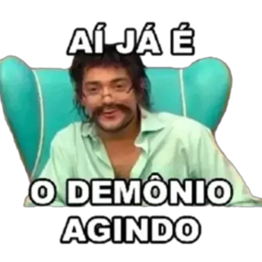 Um homem com bigode e um sorriso forçado, com texto 'QUE SATISFAÇÃO ASPIRA' sobreposto.