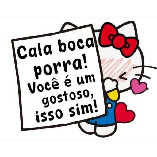 Hello Kitty holding a sign that says 'Cala boca porra! Você é um gostoso, isso sim!' with a pink heart in her mouth and another red heart on her arm.