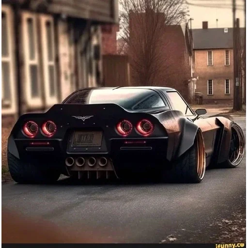 A black sports car with red rear lights on an urban street.