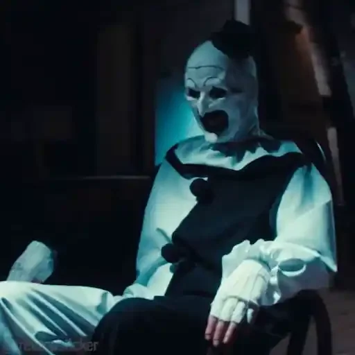 Um homem usando uma máscara branca de Halloween com olhos pretos, parecendo assustador, em um ambiente escuro.