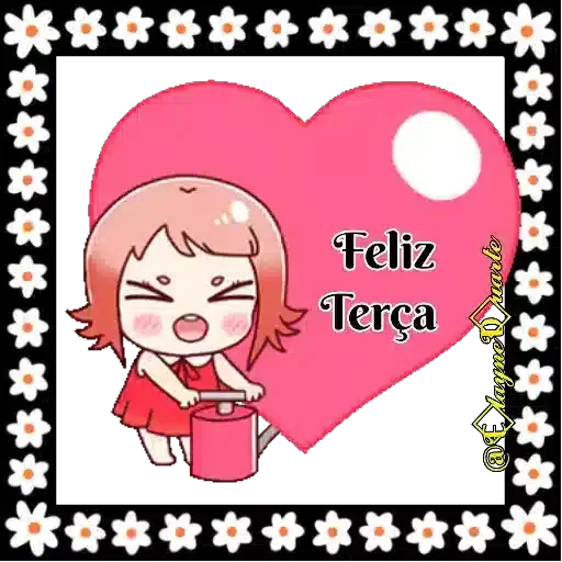 Um desenho com flores cor-de-rosa e a frase 'Feliz Terça!' em letras grandes e decorativas. O 'O' da palavra 'Feliz' é…