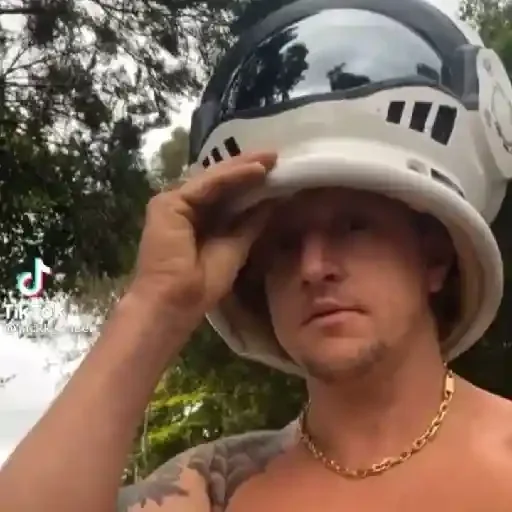 Shirtless man with a gold chain, adjusting an astronaut helmet in the forest, with TikTok logo in the background.