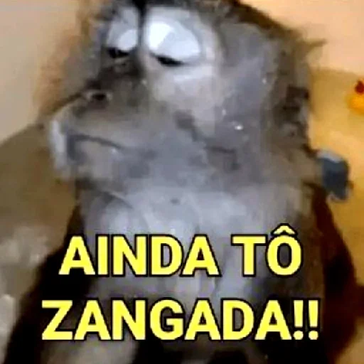 A gray cat with a displeased expression, half-closed eyes, and the text 'AINDA TÔ ZANGADA!!' in yellow.