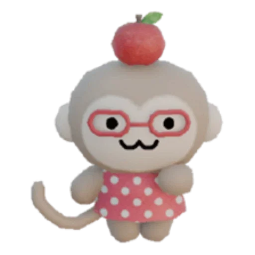 A plush monkey with pink glasses, a pink and white polka-dot dress, and a red apple on its head.