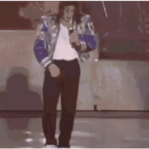 Homem com jaqueta prateada e azul, calça preta e chapéu, em uma pose de dança.