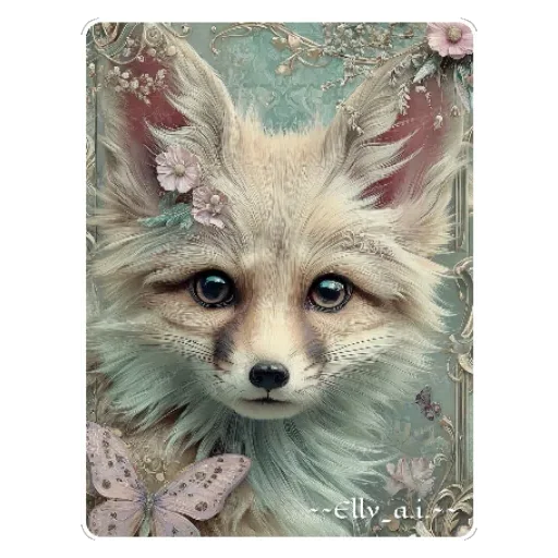 Face of a fox with white and gray fur, blue eyes, and pointy ears, decorated with flowers and pink butterflies.