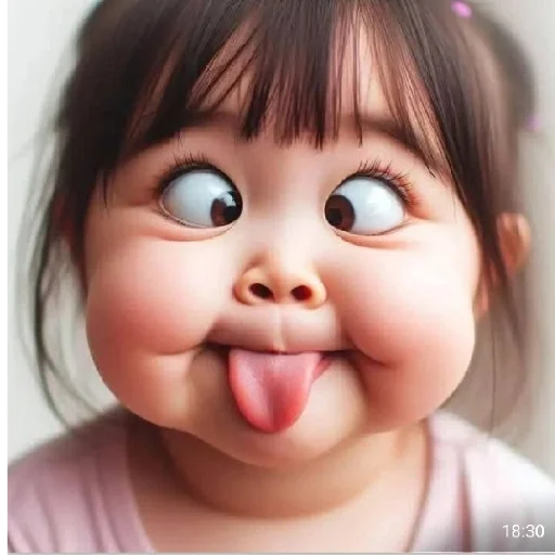 A girl with rosy cheeks and wide eyes, making a funny face with her tongue out.