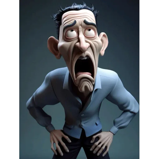 A man with a surprised or shocked expression, hands on hips and mouth open. He is wearing a blue shirt and black pants.