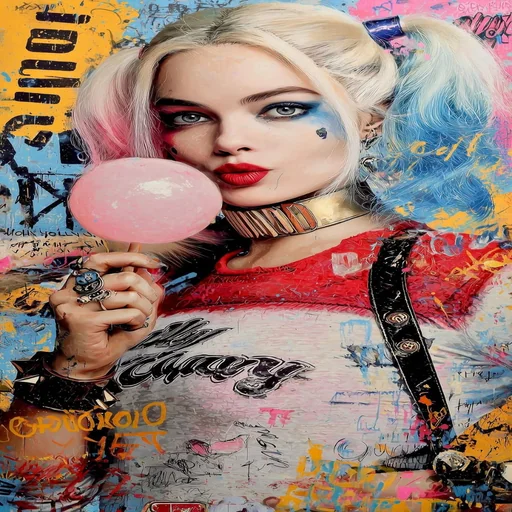 Harley Quinn, depicted with blonde and pink hair, colorful makeup, holding a pink bubblegum bubble in her mouth, wearing a white shirt with red details and black text.