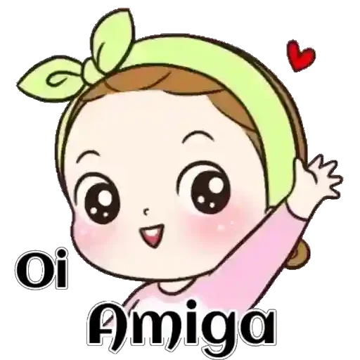 A girl with large, rosy cheeks and eyes, wearing a green headband, waving her hand. A red heart is next to her and the text 'Oi Amiga' is below.