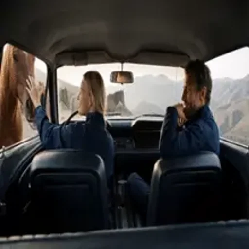 A couple inside a car, with a mountainous landscape in the background. The woman has her hand on the window and the man beside her, both wearing blue jackets.