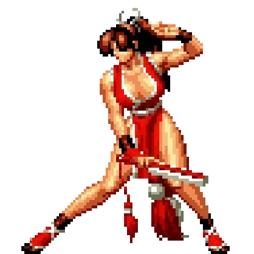 A woman with brown hair in a red dress, with a determined expression, holds a large red sword.