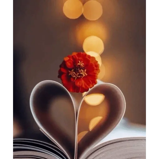A red flower on a book page folded into a heart shape, with warm lights in the background.