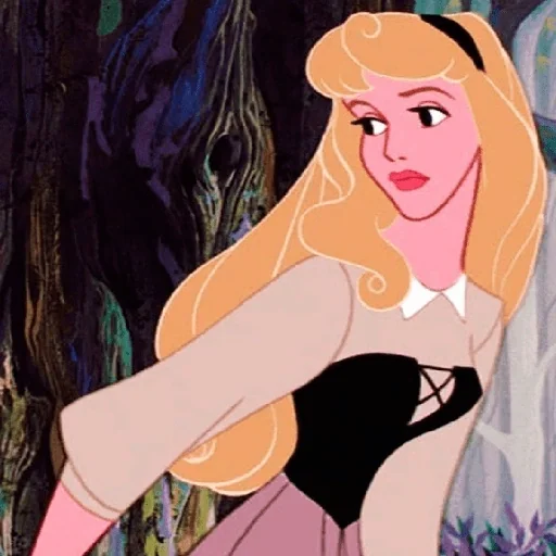 Princess Aurora from Sleeping Beauty with a curious expression, wearing a pink and black outfit.