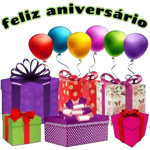Colorful gifts with balloons and the phrase 'feliz aniversário' (Happy Anniversary).