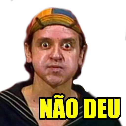 Man with a surprised expression and wide eyes, wearing a colorful cap and a blue shirt, with the text 'NÃO DEU' in yellow.