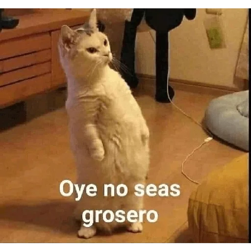 A white cat standing on its hind legs and one front paw, looking sideways. Overlaid with the text 'Oye no seas grosero'.