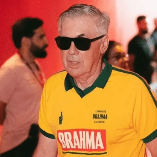 An older man wearing dark sunglasses and a yellow shirt with Brahma logo.