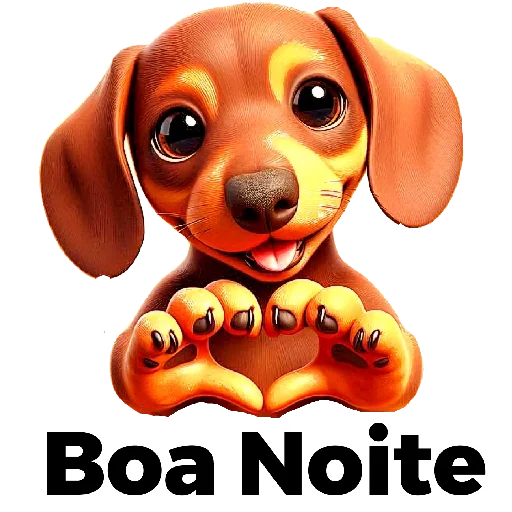 A brown dachshund with big eyes and a happy expression, with paws together and the phrase 'Boa Noite' below.