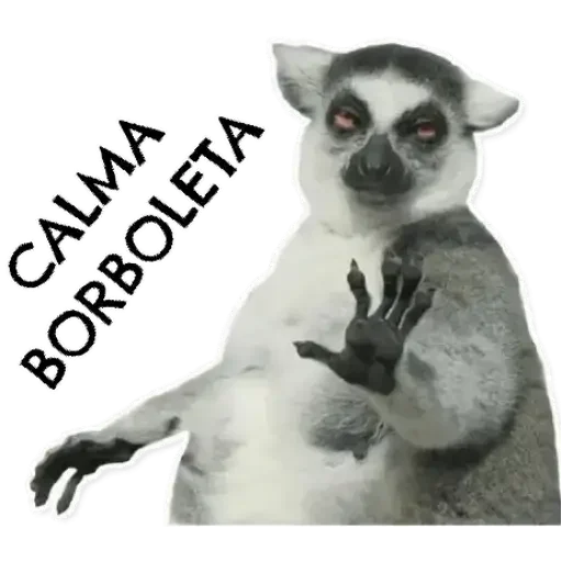 A gray lemur with red eyes and a raised hand, with the text 'CALMA BORBOLETA' beside it.